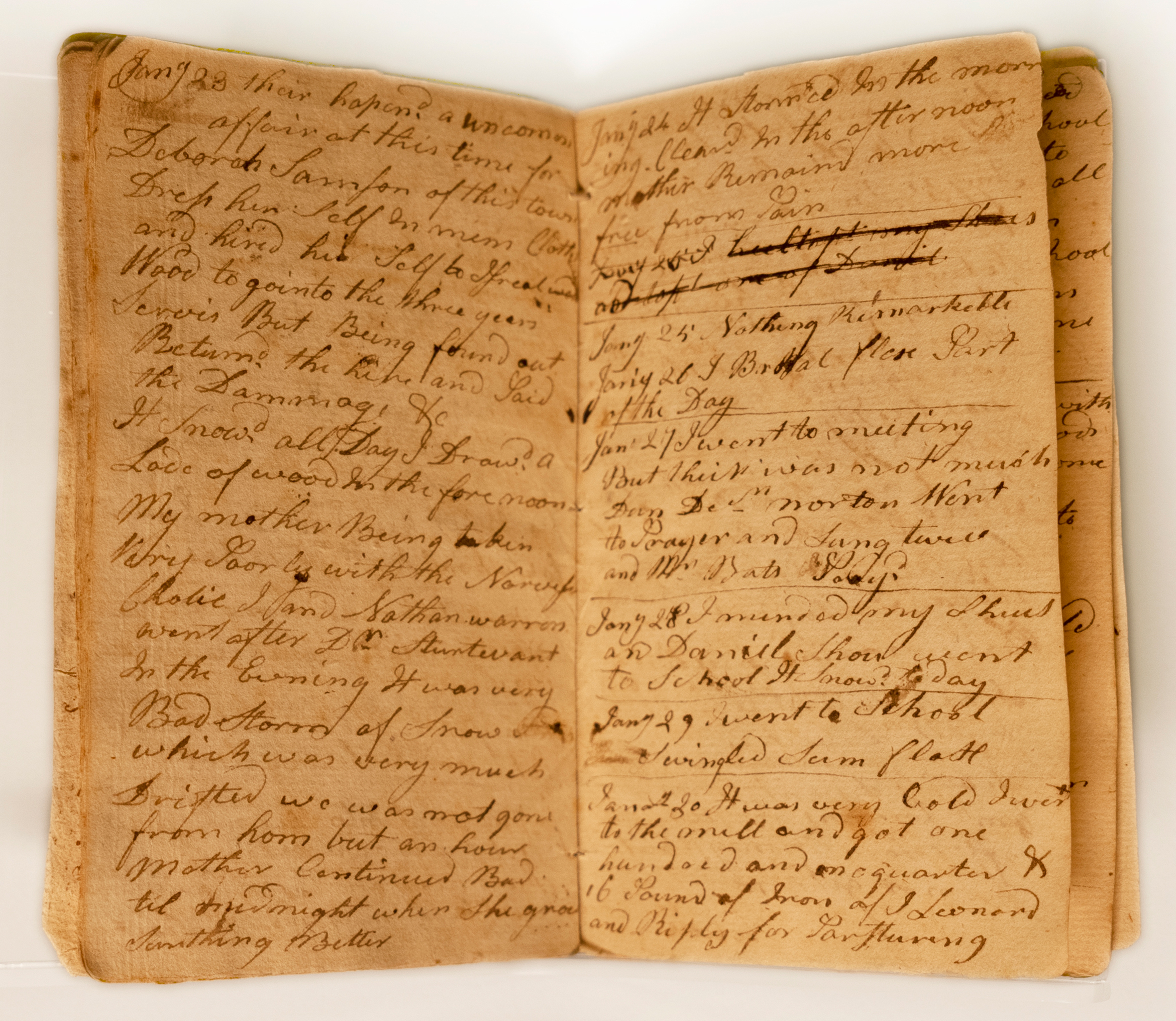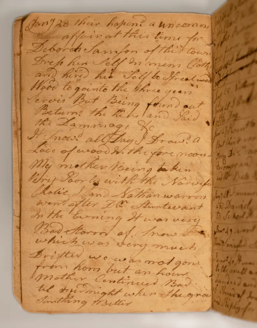 Abner Weston, a corporal in the Massachusetts militia, kept this pocket diary in 1782 as a record of his wartime experience between campaigns. Weston’s journal provides a significant record of his wartime experiences between campaigns. The most noteworthy entry is his Jan. 23, 1782, description of fellow Middleborough resident Deborah Sampson’s first documented attempt to join the Continental Army. His entry described an “uncommon affair,” in which Sampson dressed in men’s clothes and attempted to enlist in the army, only to be discovered and fined. Weston’s reference to Sampson includes little judgement of her actions. This document is the earliest surviving account of her first attempted enlistment.