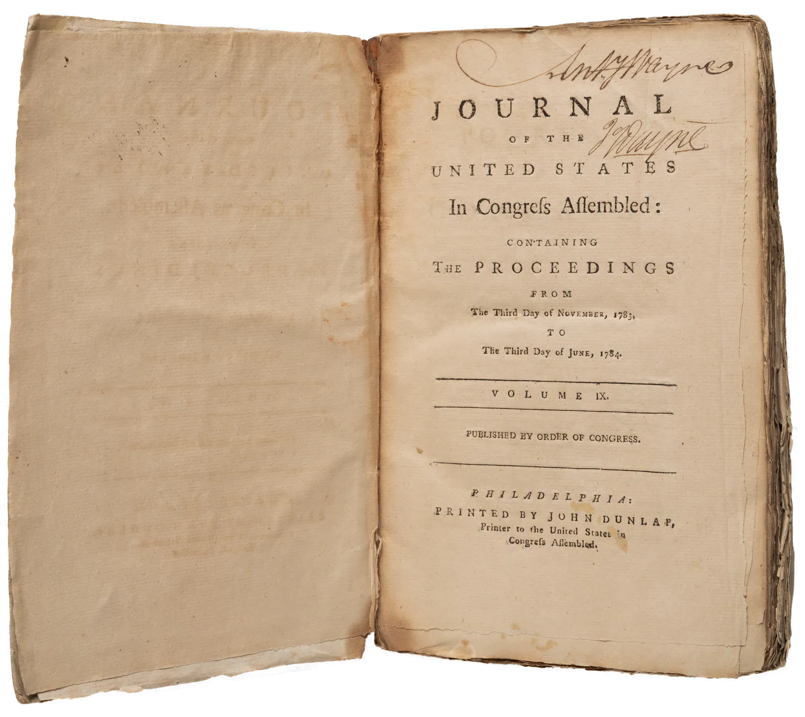 Pennsylvanian "Mad" Anthony Wayne (1745-1796) received his nickname during the Revolutionary War for his daring military exploits and legendary temper. Brigadier General Wayne participated in many significant battles against British forces, most famously in a 1779 attack on British fortifications at Stony Point on the Hudson River in New York. Wayne's political career is less well known; following the end of the war with Britain in 1783, Wayne served one term in the Pennsylvania State Legislature (1784) before moving to Georgia, where he was granted a rice plantation that included enslaved African Americans. In Georgia, he served as a delegate to the state convention that ratified the United States Constitution (1788) and as a representative of Georgia in the United States Congress (1791). In 1792, Wayne was placed in command of military forces struggling against the Native American nations in the Northwest Territory. Wayne's military victory at the Battle of Fallen Timbers (1794) and his diplomatic settlement with the tribes at the Treaty of Greenville (1795) secured American control of the upper Ohio Valley for the fledgling United States. This volume of the Proceedings of the Continental Congress was published in Philadelphia in 1784 and bears Wayne's signature on the title page.