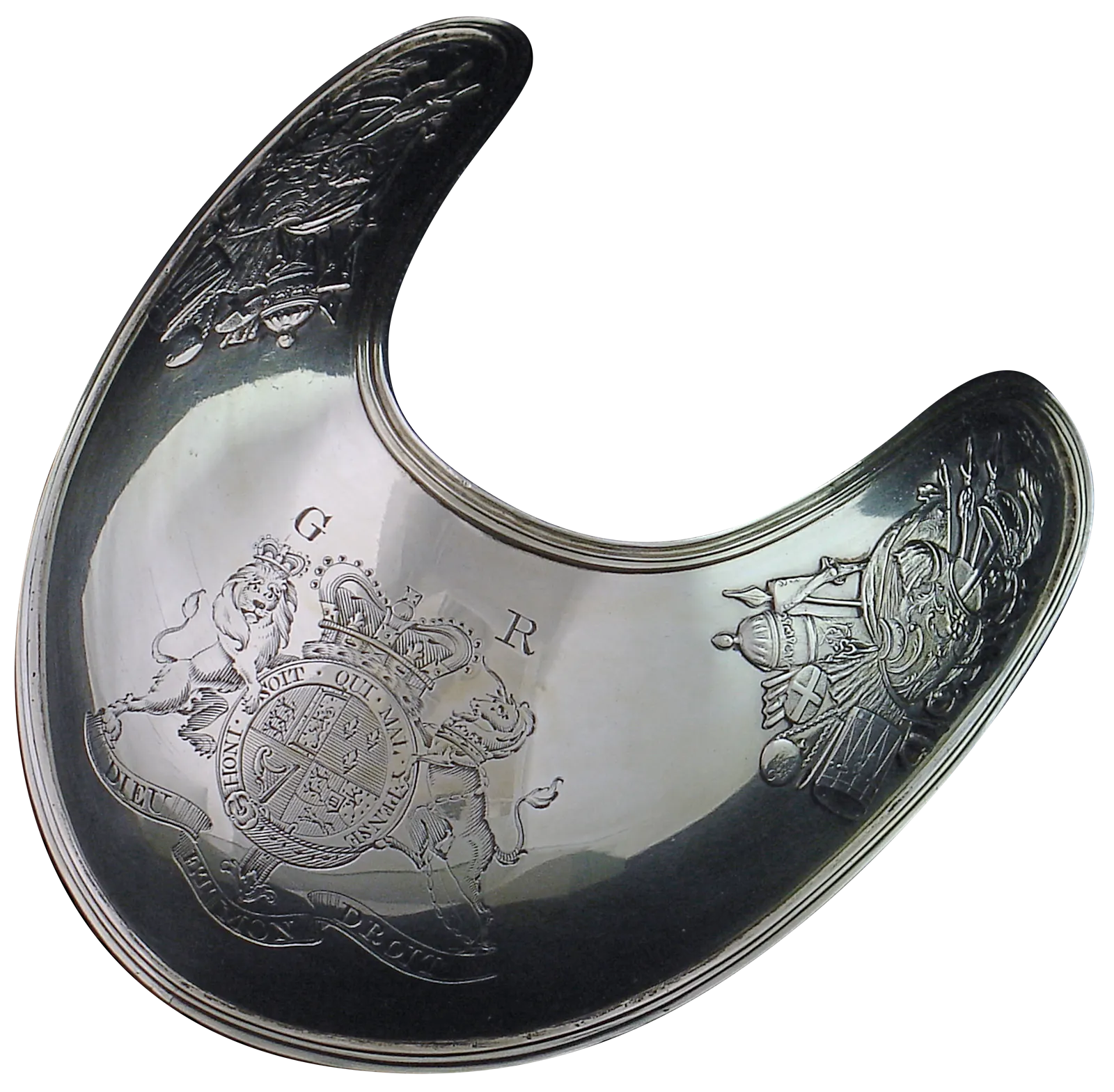 This dazzling silver gorget was made in England in 1775 or 1776 for an officer of the 60th, or Royal American, Regiment. This British army unit was originally raised in Pennsylvania and surrounding colonies during the French and Indian War (1754-1763). Elements of the corps served in many campaigns of the Revolutionary War.