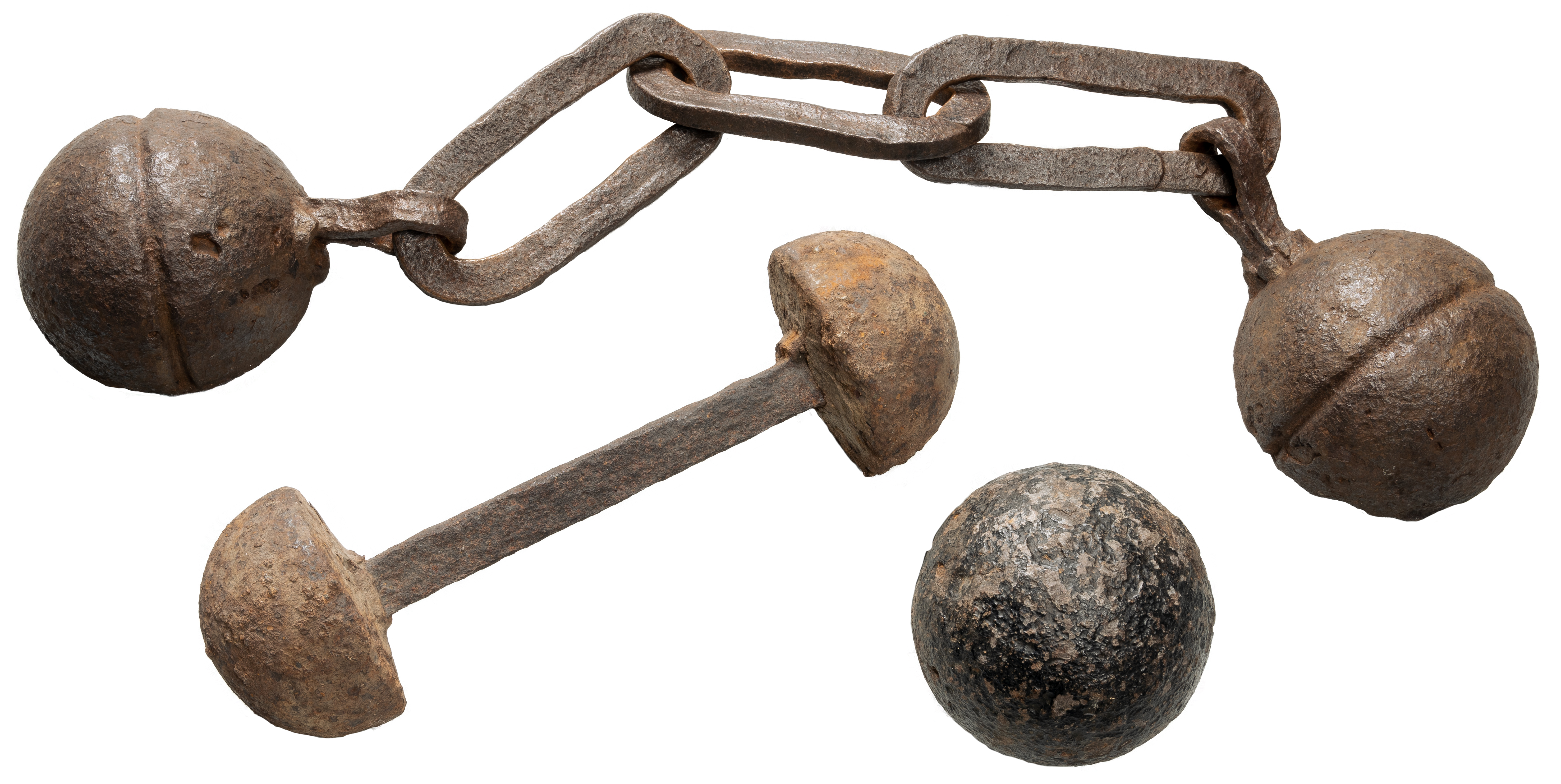 Naval gunners fired a range of specialized projectiles from their cannons in order to disable or destroy enemy vessels. Solid iron "round shot" were used to pound and penetrate the heavy wooden planks that made up a ship's hull. Gunners also used "bar shot" and "chain shot," which tumbled through the air with a terrifying buzz, to knock down the masts and cut away the sails and rigging of opposing ships. Cramped together above and below decks, sailors of all nationalities suffered horrific wounds both from projectiles such as these and the showers of wooden splinters that erupted from their battered ships after impact.