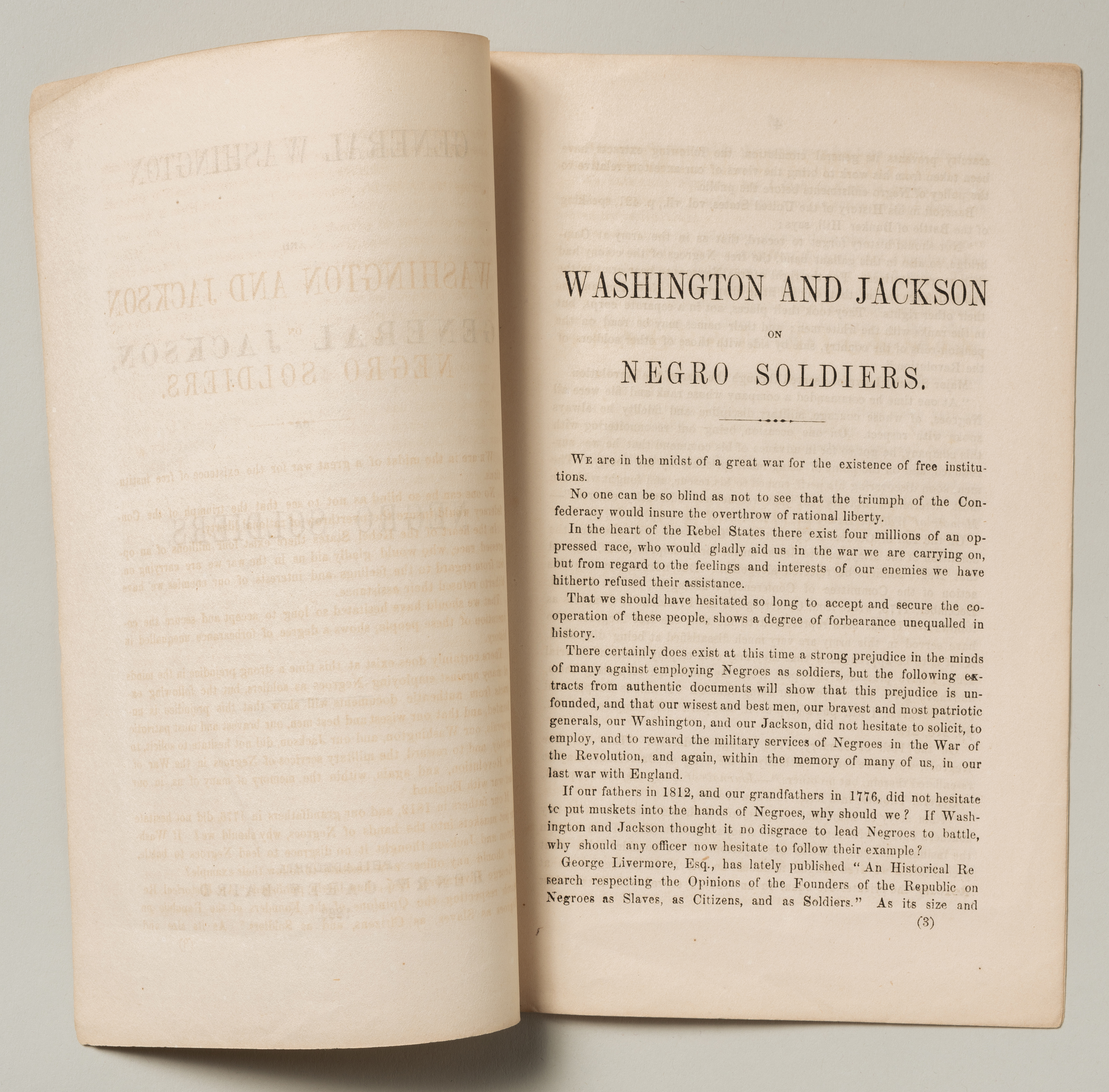 This pamphlet was published by the Union League of Philadelphia to encourage the enlistment of troops of color during the Civil War. The author drew on African Americans' record of distinguished service in the Revolutionary War to persuade those who doubted their capacity for bravery and valor.