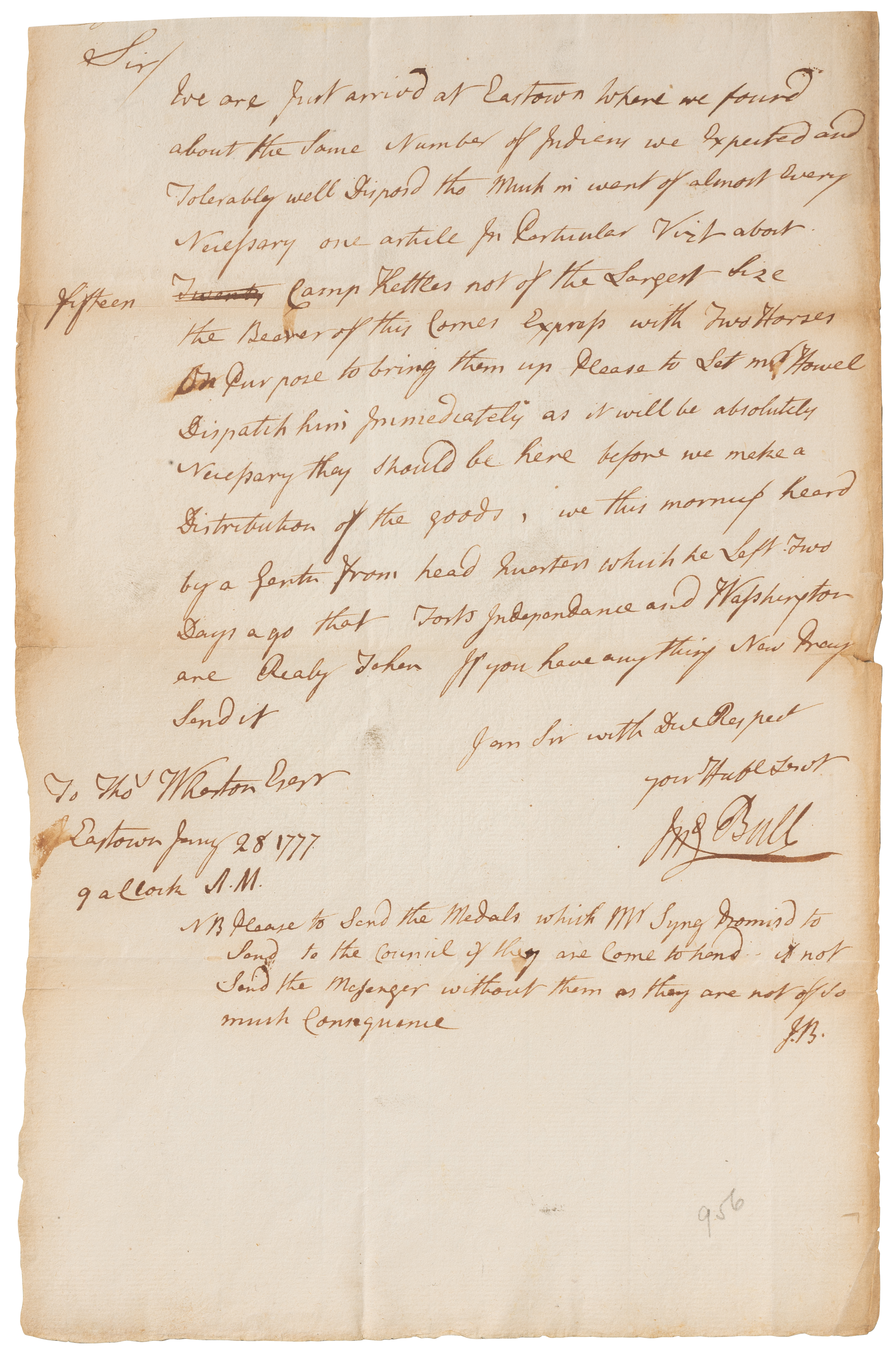 In this January 1777 letter, Colonel John Bull of Pennsylvania reports on preparations for a council with Native American men, women, and children from communities in the upper Susquehanna River Valley. Professing neutrality in the conflict between Great Britain and the United States, the Native American leaders requested that illegal squatters be removed from their land. Anger over such encroachments, which Pennsylvania authorities ignored, led many Native Americans to side with the British in the Revolutionary War.