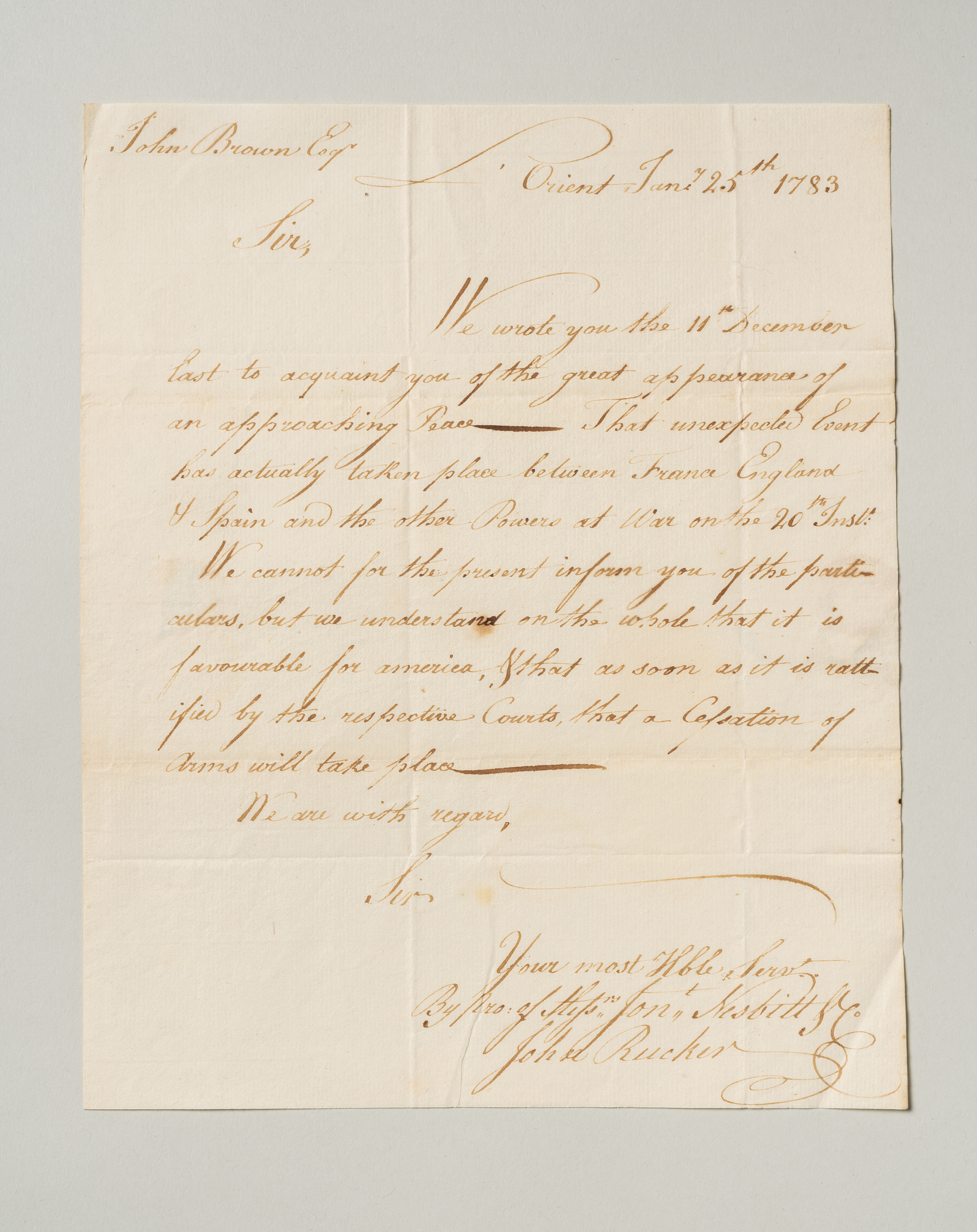 This private letter from merchant John Rucker in l'Orient, France, carried the welcome news that Britain, France, and Spain had recently signed final articles of peace that would end the war and establish the independence of the United States of America. Its recipient John Brown was an assistant to Robert Morris, the "financier of the American Revolution."
