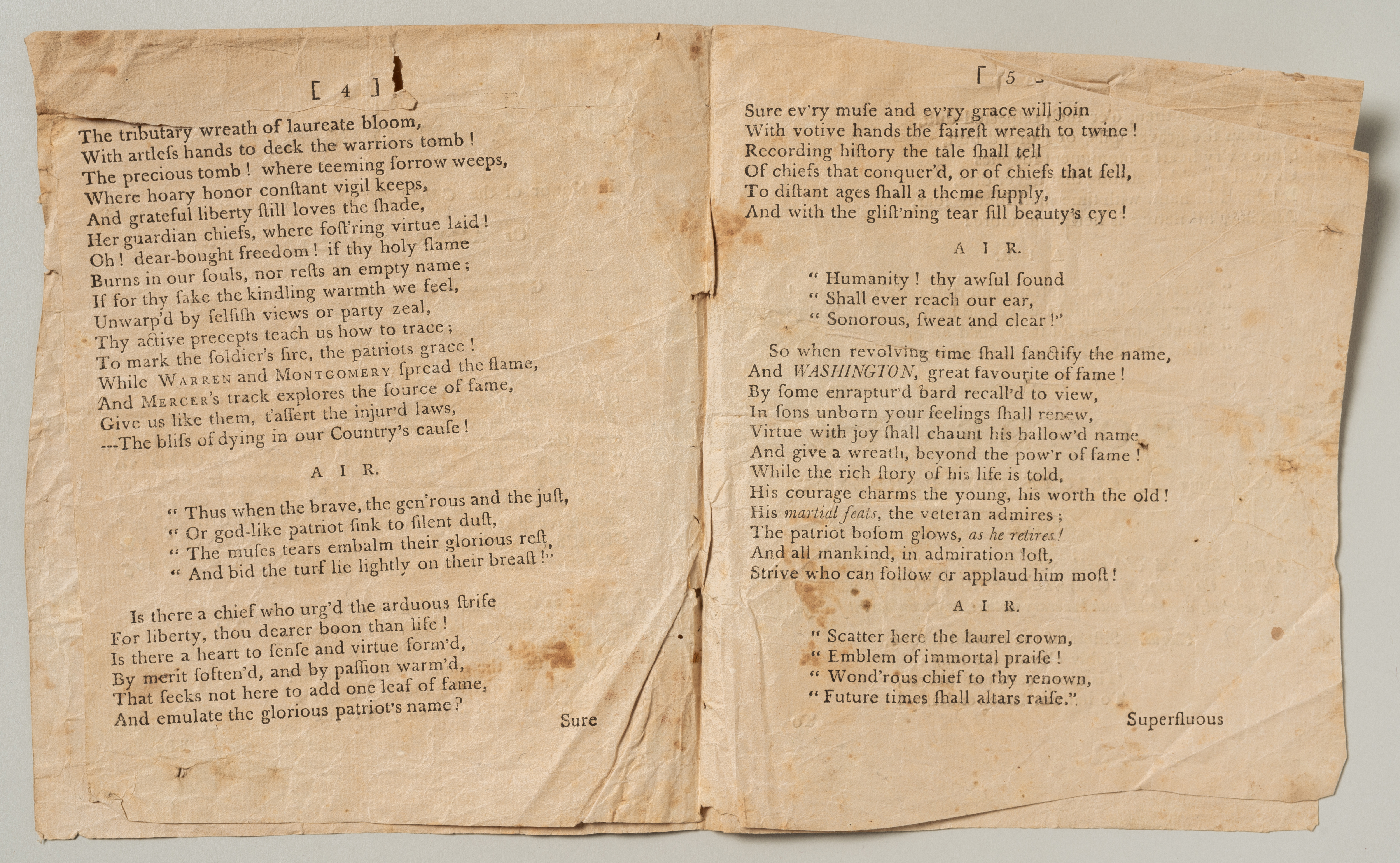 Philadelphia printer Thomas Bradford issued this folded sheet of patriotic song lyrics in 1784, the year Lewis Hallam Jr.'s American Company returned to Philadelphia's Southwark Theater (built in 1767). Theatrical performances, which many American revolutionaries considered a sign of British corruption and luxury, had been banned during the Revolutionary War and remained a controversial issue in the 1780s.