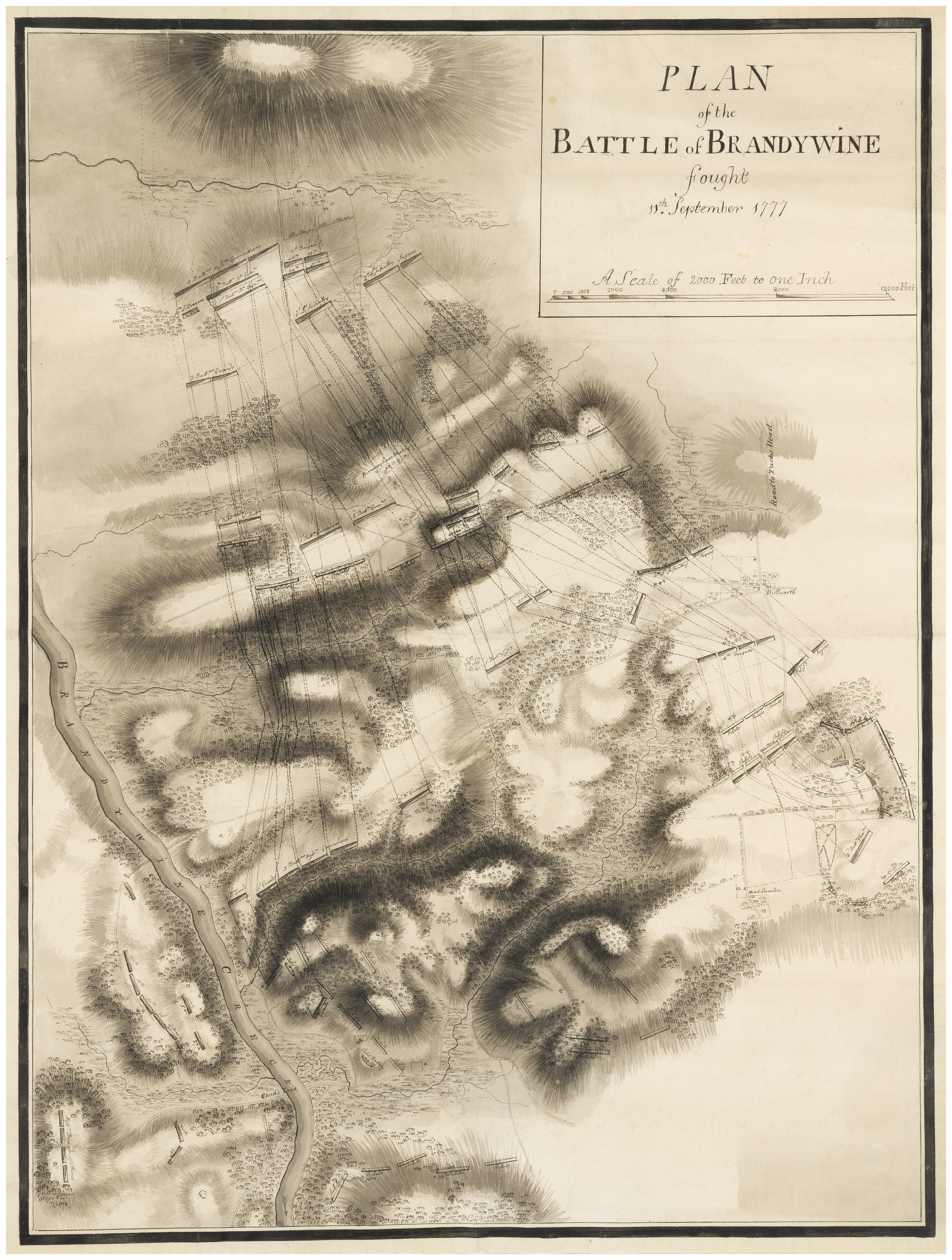 This detailed plan shows British, Hessian, and American troop positions and movements during the Battle of Brandywine on Sept. 11, 1777. This hard-fought action ended with General George Washington's army withdrawing east towards Chester, Pennsylvania. The exhausted Crown forces encamped at Dilworth (visible at the right-center of this plan) and neighboring areas until Sept. 15, when they resumed pursuit of Washington's forces before capturing Philadelphia on Sept. 26, 1777. During the four-day encampment on the battlefield, British engineers surveyed the area and recorded details of the engagement in a series of plans, including this example.