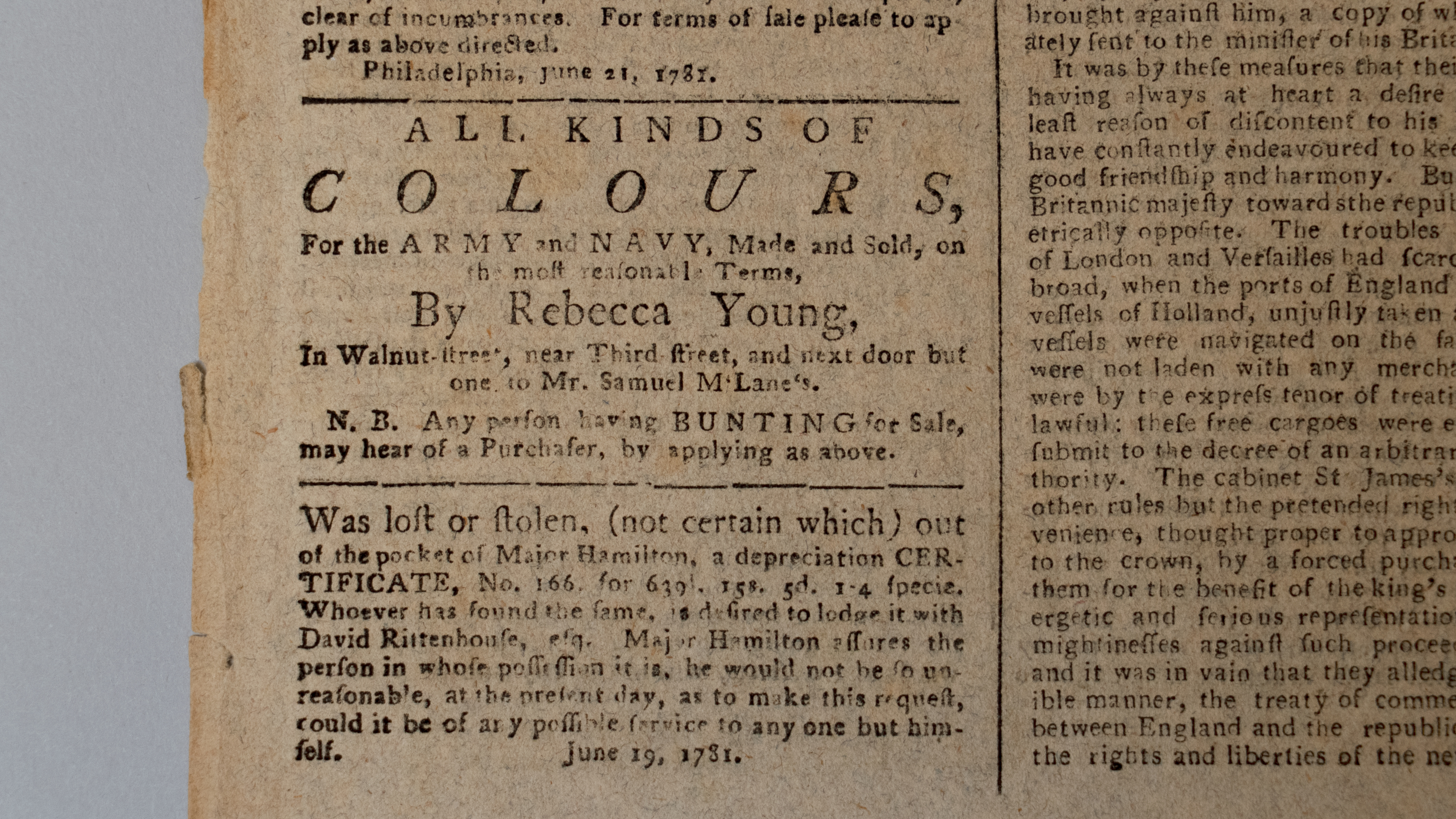 Rebecca Flower Young, a flag maker in Philadelphia, placed this ad in The Pennsylvania Packet, a Philadelphia newspaper, on June 26, 1781. Working about a block away from where the Museum of the American Revolution is today, Young made standards, or flags, for the Continental Army and Navy, drum cases, and blankets. Young’s daughter Mary, born in 1776, likely worked with her mother to do these military sewing projects. Mary, later known as Mary Young Pickersgill, made the flag that flew over Fort McHenry in Baltimore. That flag inspired Francis Scott Key to write the “Star-Spangled Banner.”