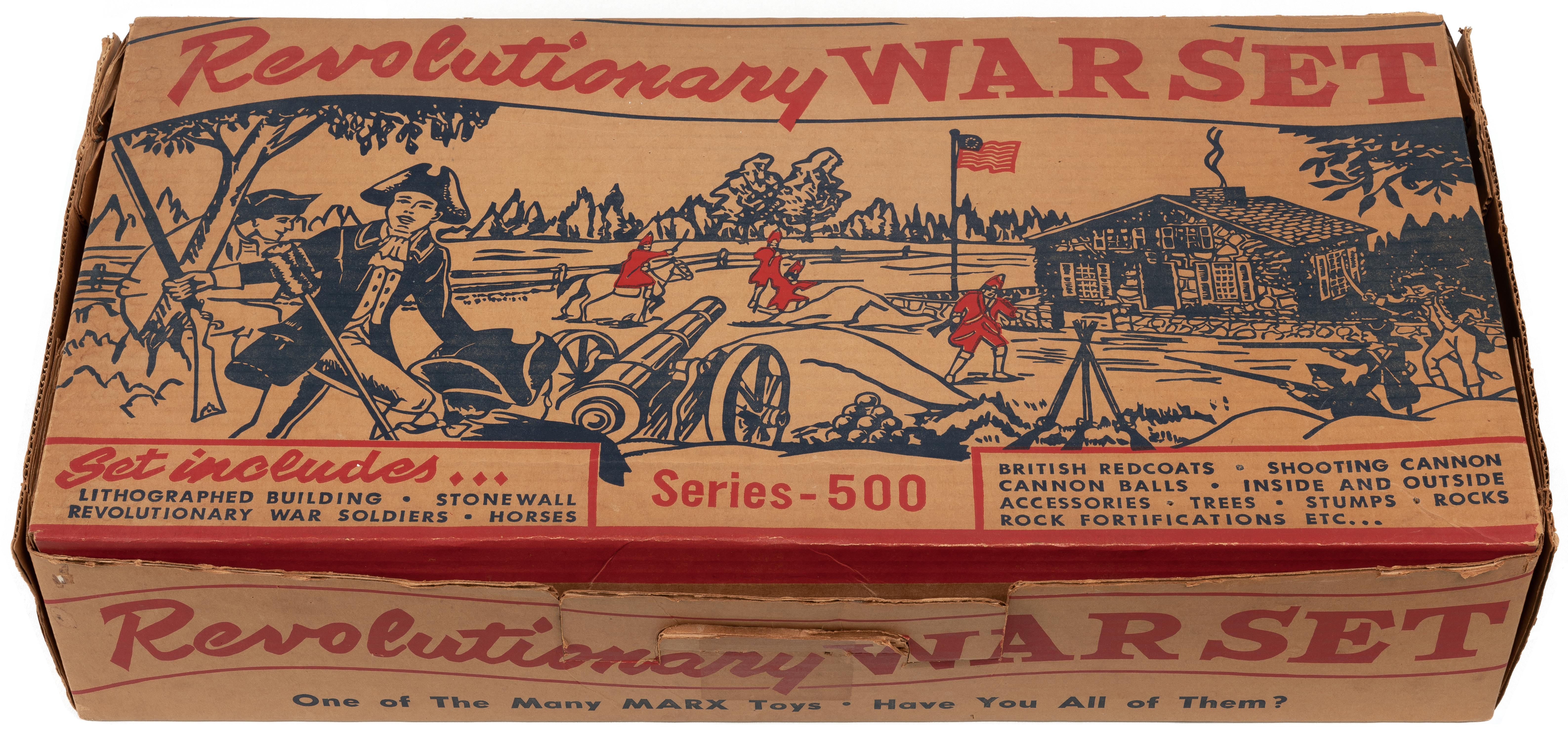 Toys are an important part of how people learn about themselves, others, their environment, and historic events. This Revolutionary War toy set from 1957 allowed children to recreate momentous battles and pivotal moments that shaped the founding of America. This set was preserved and donated to the Museum by the person who played with it as a child in the late 1950s. The toy set included Revolutionary soldiers in blue, the British in red, rearing horses, and a “Sons of Liberty” tavern.