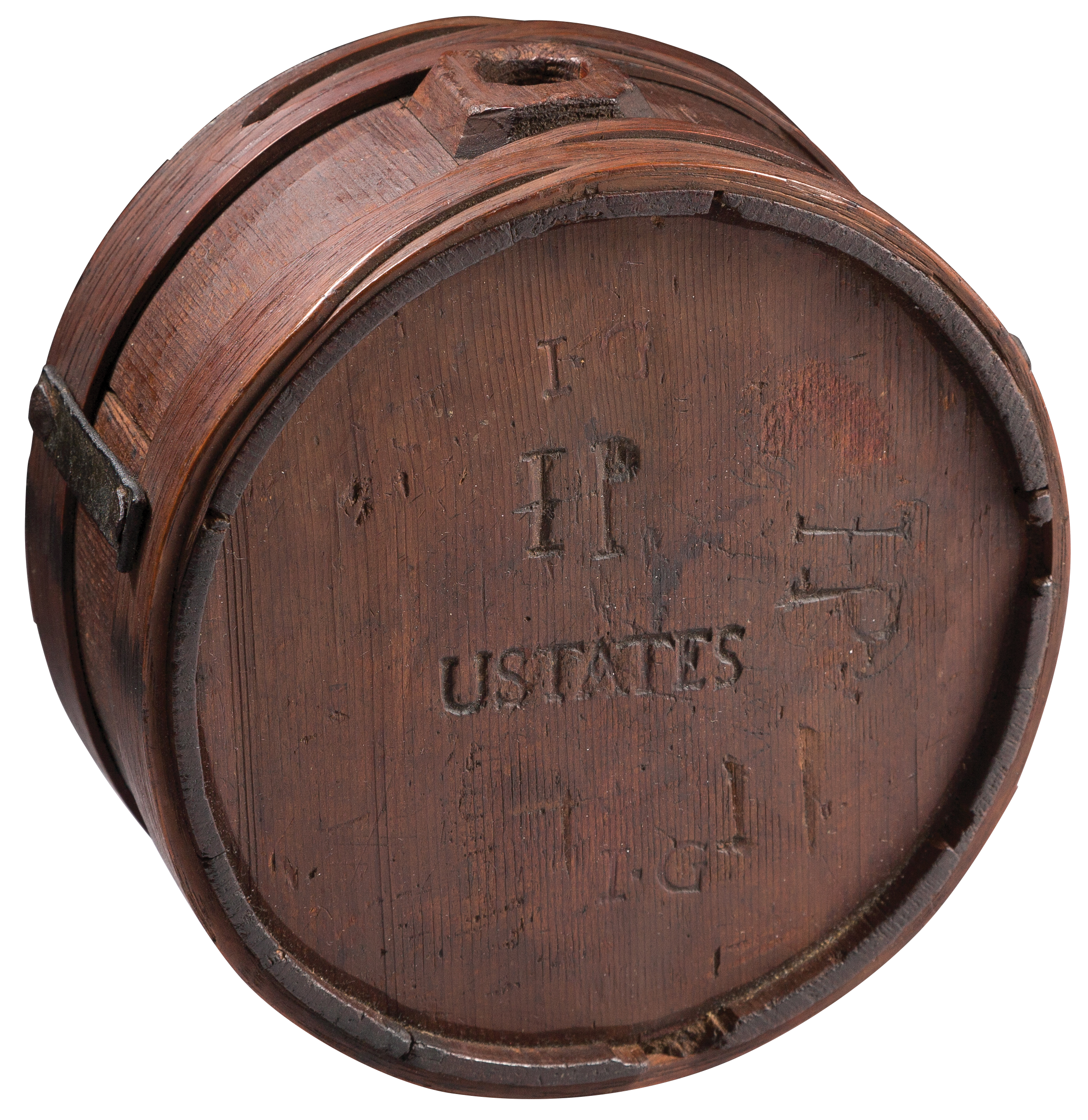 This extremely rare wooden soldier's canteen is marked "USTATES," indicating Continental Army usage. Alarmed by chronic shortfalls in arms and equipment caused in part by thefts and negligence, the Continental Congress directed in February 1777 that all arms and accoutrements belonging to the country should be marked to show ownership by the United States.