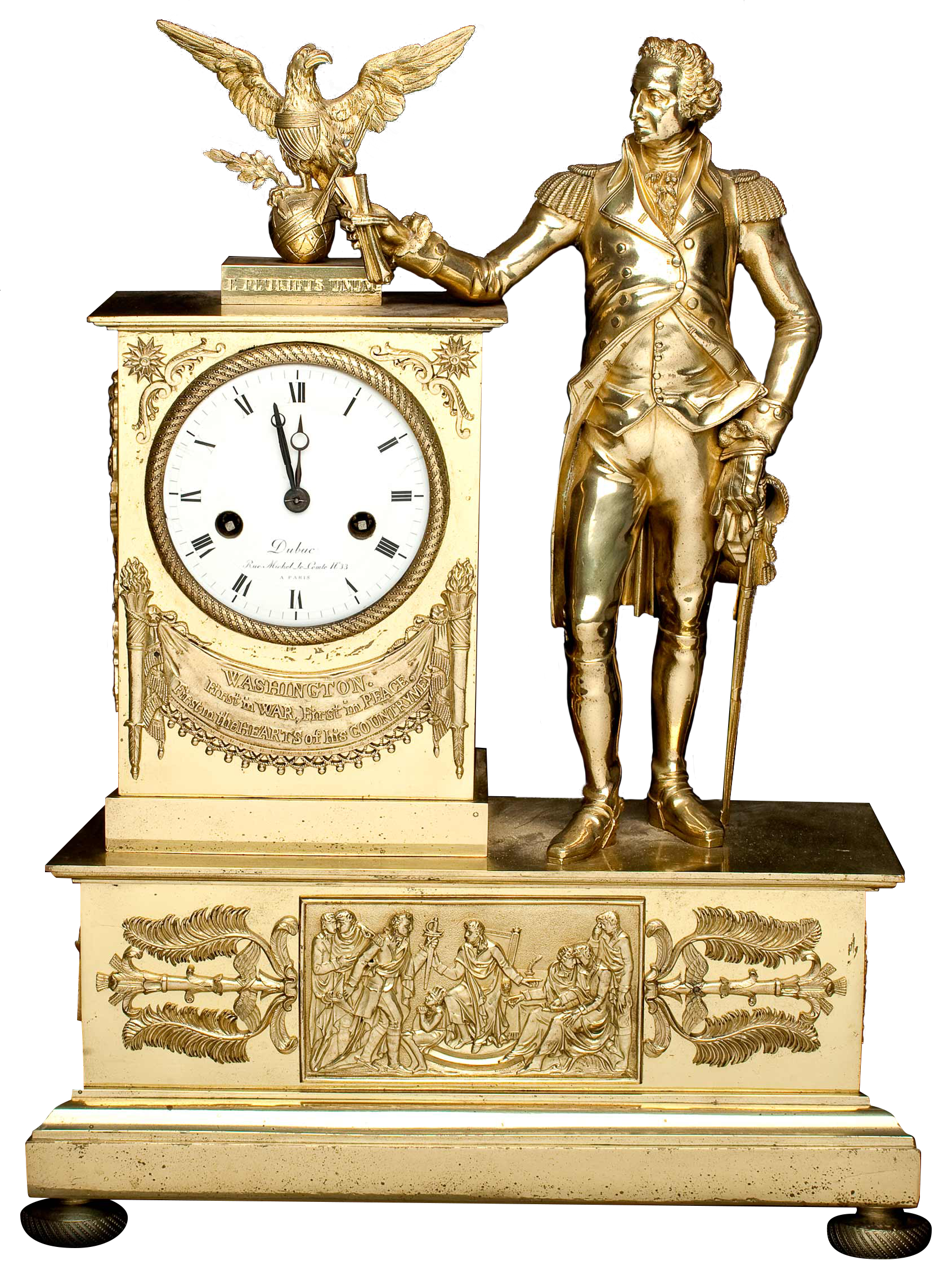 French bronze worker Jean-Baptiste Dubuc produced a small number of elegant mantel clocks for export to the American market following George Washington's death in December 1799. Featuring a nobly posed Washington derived from John Trumbull's 1792 painting of Washington before the Battle of Trenton, this piece includes a tableau representing Washington resigning his commission to return to civilian life. This act recalled the virtuous example of Roman general Cincinnatus, affirming the principle of civilian control of the military. Words from Major General Richard Henry Lee's famous eulogy of Washington appear below the dial: "First in war, first in peace, first in the hearts of his countrymen."